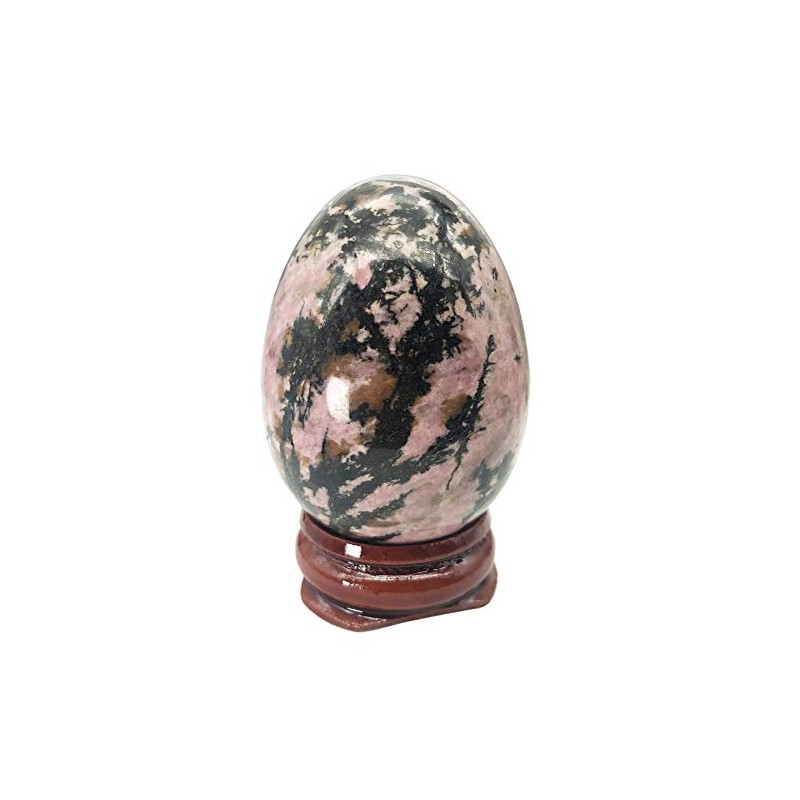 Ladeukoi Stone Egg Figurine, Polished Healing Crystal Easter Eggs Sphere Sculpture with Wood Stand, Rhodonite, 1.8"