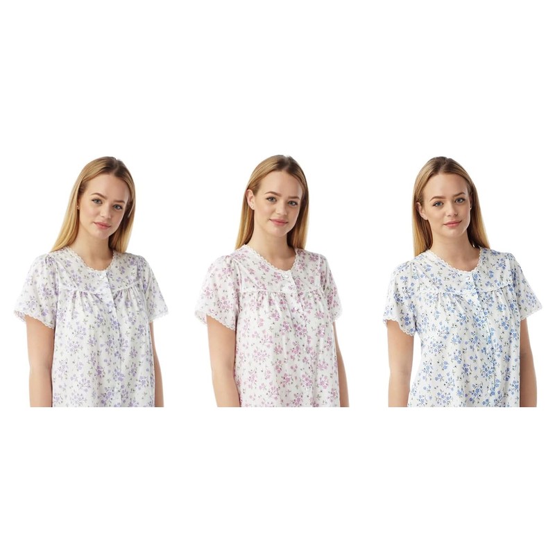 Soft, cool and breathable in pure poly cotton, our best selling button through night dress has been updated this season with a floral print. We've kept the shape and cut classic with a short sleeve night gown detailed with piping along the neckline, sleeves with lace and, more feminine feel.