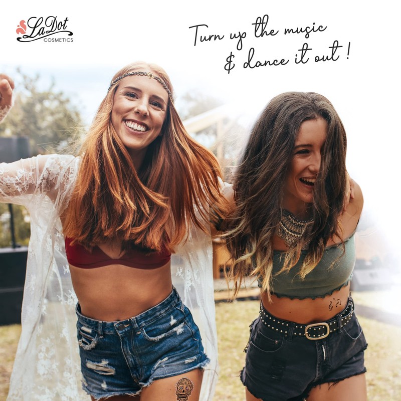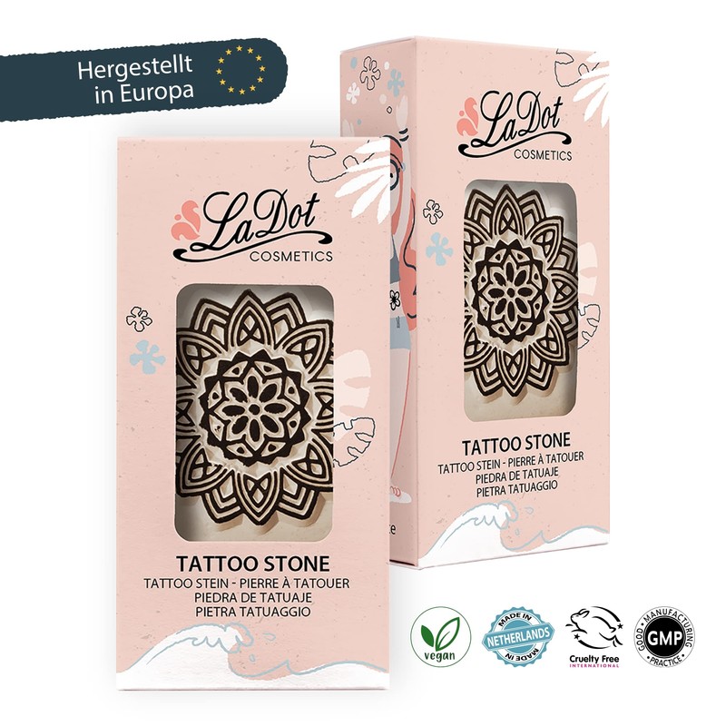 - Temporary – with LaDot you don't need to make a decision for life. The waterproof ink lasts up to 3 days on the skin depending on skin type. Important: suitable for the tattoo stamp you need an ink pad and the body make-up ink.