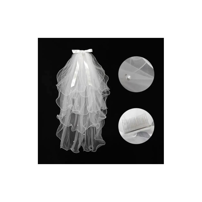 - This short veil for brides features a beautiful white bow, dotted with faux pearls, stylish and cute, it drapes elegantly over the shoulders and cascades down the back, creating a stunning visual effect.