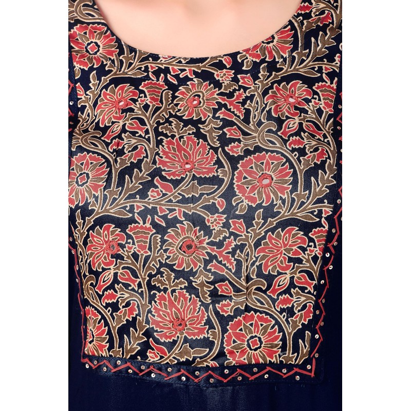 Ladyline Womens Stylish Silk Kurti Tunic Ajrakh Printed Hand Work Indian Kurta Dress (SEK SHRM950) (42/ Navy)