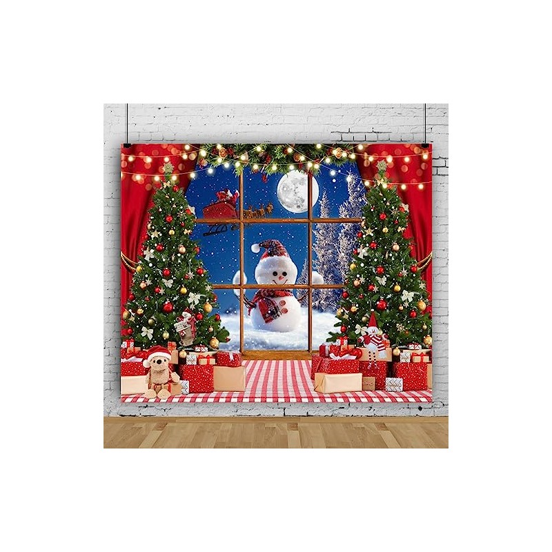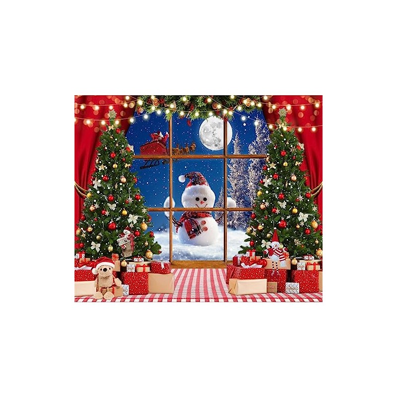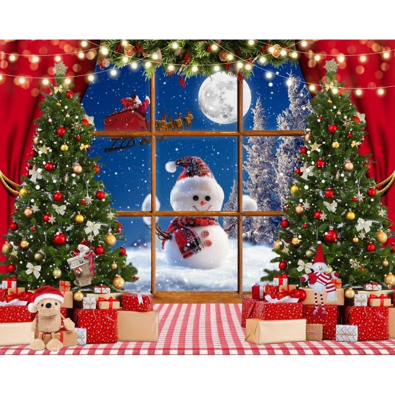 Laeacco Christmas Window Photography Backdrops 10x8FT Snowy Winter Christmas Background Windowsill Red Curtains Xmas Trees Snowman Merry Christmas Party Decorations Banner Photo Booth Studio Props