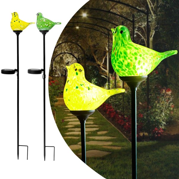 LaElvish Garden Hand Blown Glass Solar Powered Garden Stake Lights Outdoor, Waterproof Cute Animal Outdoor Figurine Lights Christmas Decor for Pathway, Patio, Yellow & Green Bird