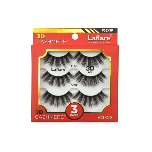 Laflare 3D Cashmere False Eyelashes 3 pcs Multipack, Ultra Soft, Glam, Wispy, Fresh, Luxurious, Cruelty-Free, Reusable, 100% Cashmere Texture, Fake Eyelashes 3 Pairs Eco Pack (F58X3P)