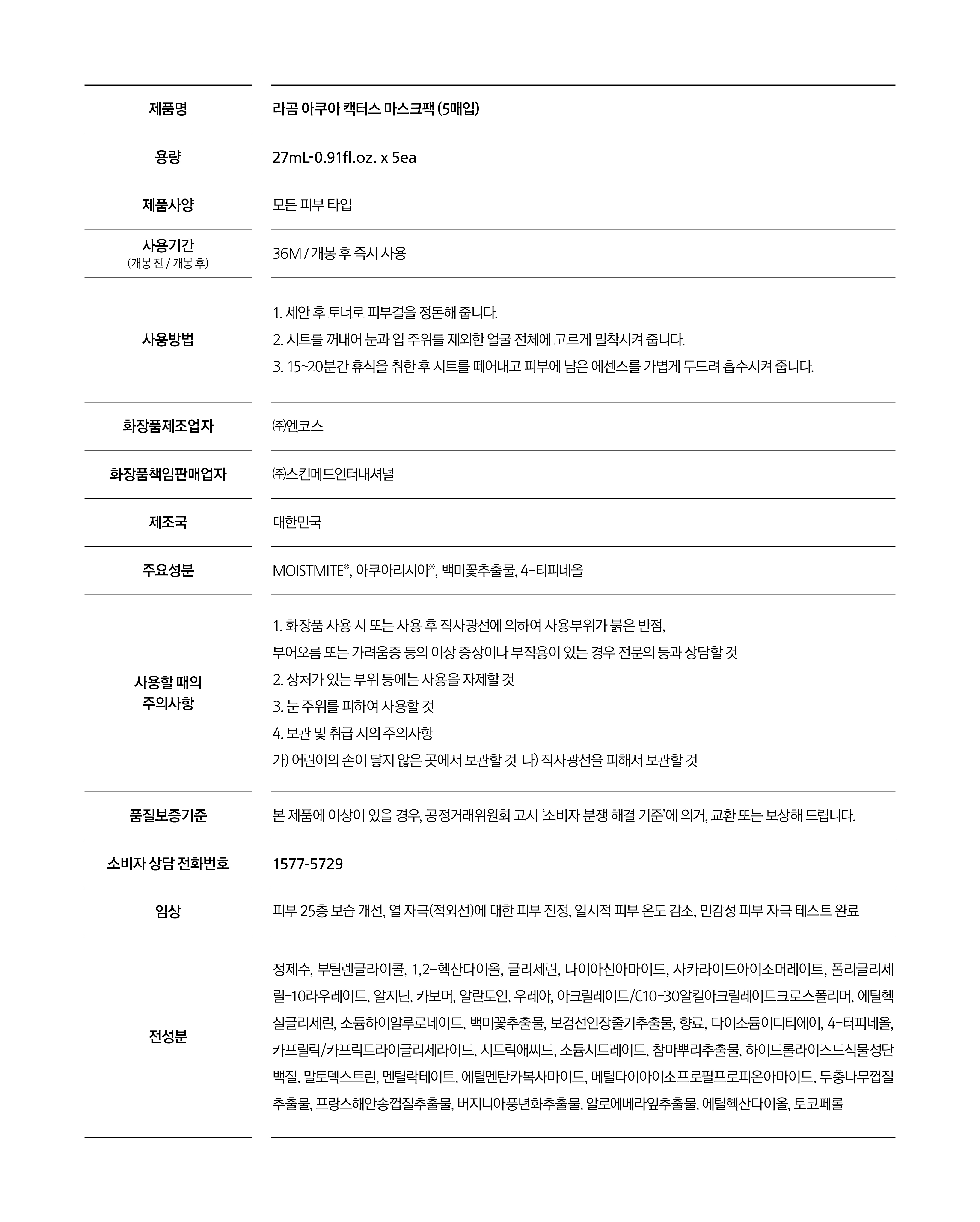 라곰 아쿠아 캑터스 마스크팩 27ml (5매입)