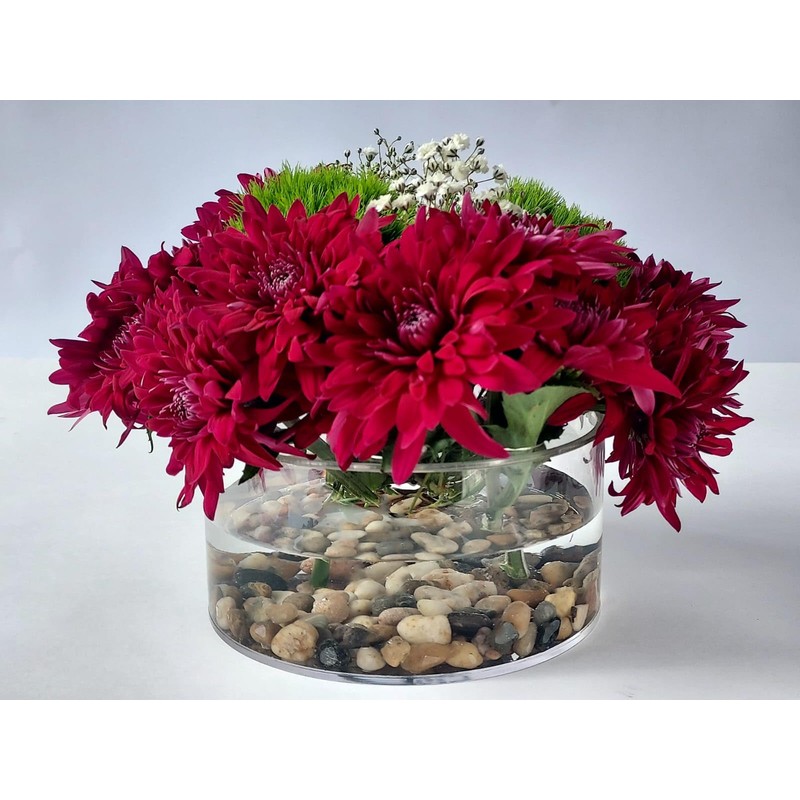 - [ELEGANT DESING & VERSATILE USE]: Set of 3 round clear acrylic vases, including one with glitter, adding sophistication to any table. Suitable for both natural and plastic flowers, making it a perfect addition to your home decor. Comes with 12 lifelike plastic flowers to get you started.