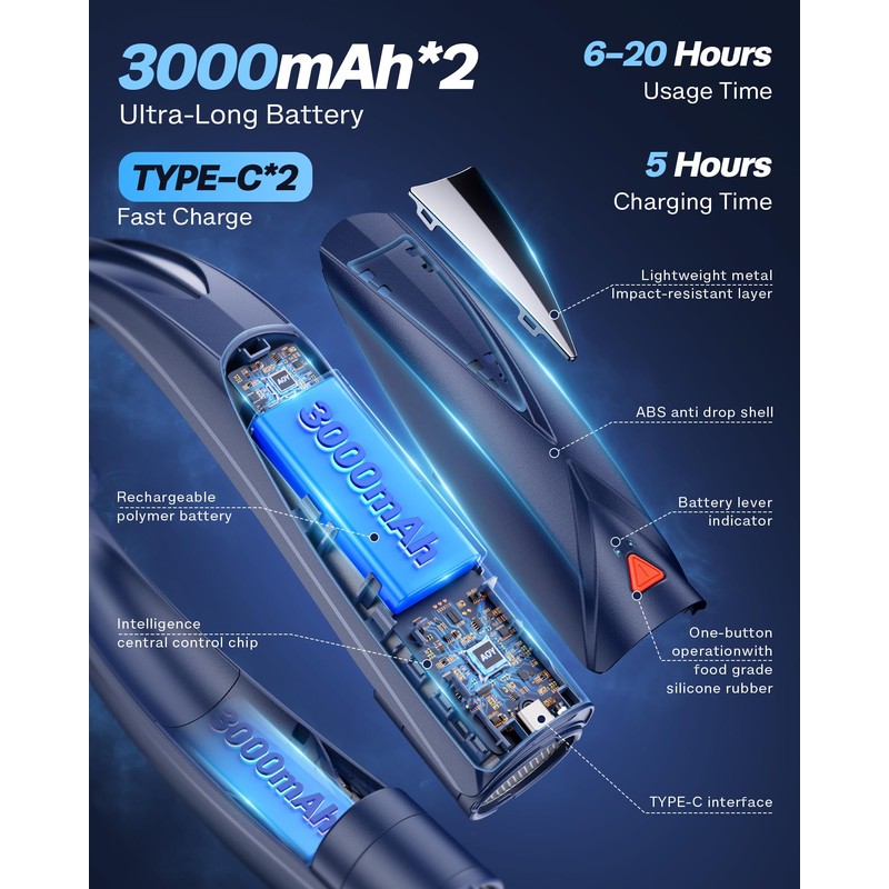 - All-Day Cooling for Outdoor & Indoor Use:Enjoy uninterrupted comfort with the 6000mAh rechargeable battery, delivering up to 6-20 hours of hands-free cooling for house chores, yard work, warehouse job, hiking, travel, outdoor adventures, gym sessions, long commutes, indoor or daily office wear. This portable neck fan charges fully in 5 hours using a standard 5V/2A adapter.