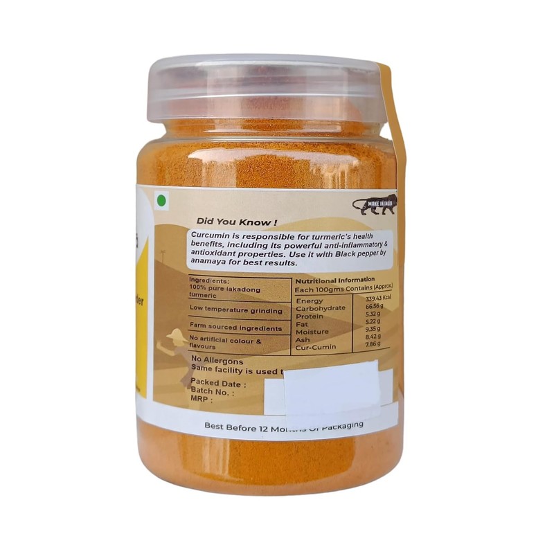- Lakadong Turmeric Brilliance: Anamayā's 100g jar contains Lakadong Turmeric, renowned for its high curcumin content, adding vibrant color and health benefits to your dishes.