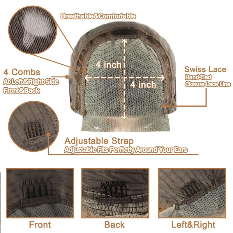 - 4 x 4 lace closure wigs human hair construction: adjustable straps and 4 combs around your ears for different sizes of head circumference, elastic net is more breathable and comfortable, free part can be side anyway, cap size is 22.5 inches for medium size.