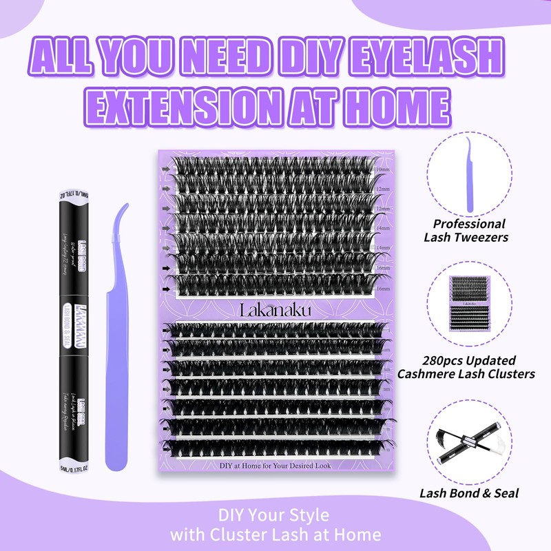 - 【DIY lash extension Kit】Buy LAKANAKU diy lash kit you will get : 1 tray 280pcs mix length cluster lashes, 1 lash bond and seal(2 in 1),1 lash applicator tweezer. This cluster lash extension kit will fulfill all your needs for diy lash at home, perfect for beginners and lash lovers!