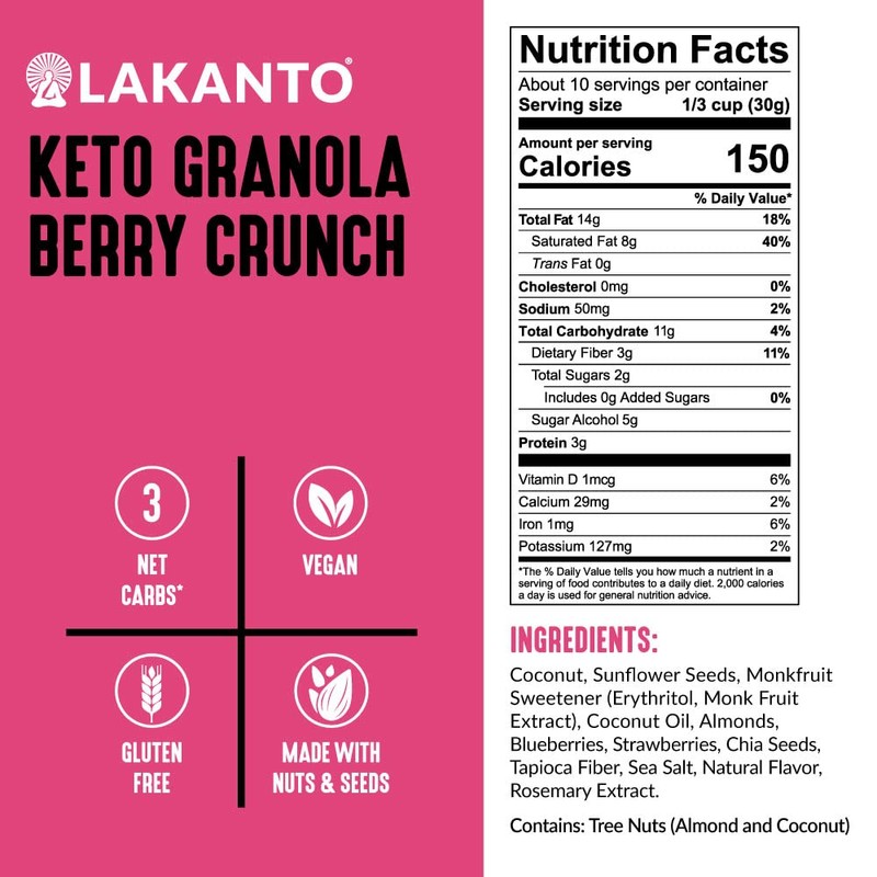 Lakanto Berry Crunch Granola - Delicious Snack, Quick Breakfast Cereal, Keto Friendly, Monk Fruit Sweetener, No Sugar Added, Vegan, Gluten Free, Grain Free, 3g Net Carbs (11 oz)