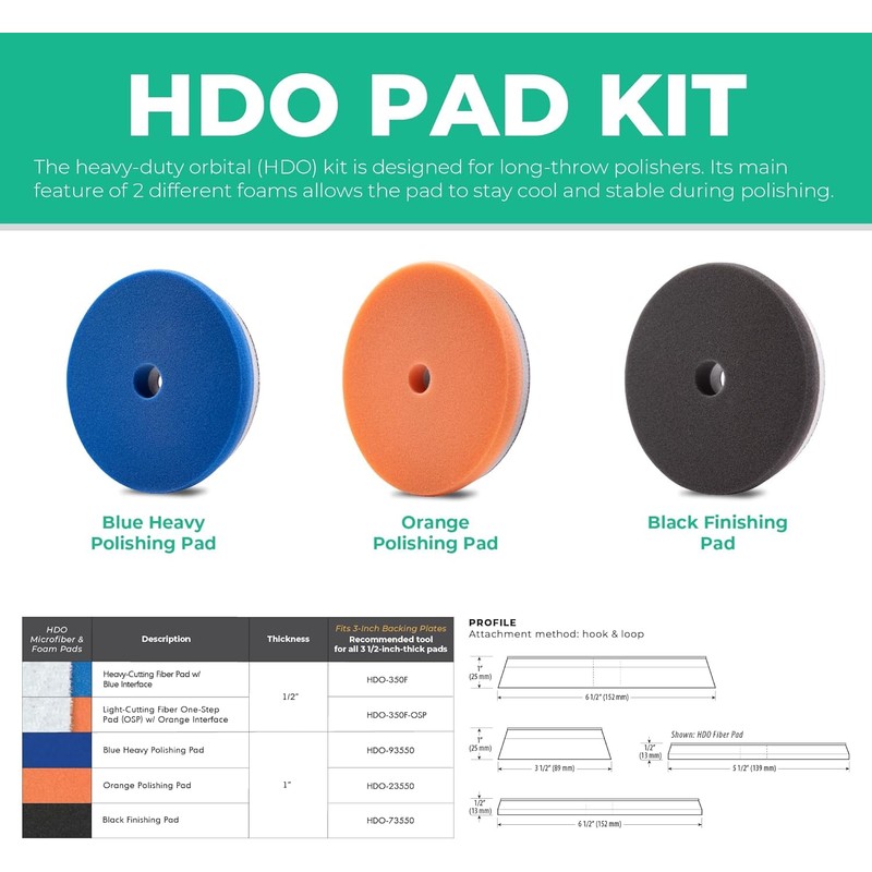 - Long-Lasting: These HDO foam buffing pads for car detailing fit 3" backing plates using a hook-and-loop attachment and are designed for long-stroke dual-action polishers. Sturdy with tapered edges, our heavy-duty polish pads for car detailing prevent pad rolling to help minimize haze.