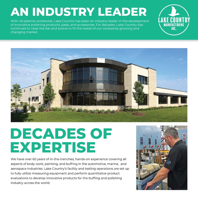 • LAKE COUNTRY PADS: A family-owned business since 1977, we manufacture detailing tools for the automotive, aviation, and marine industries as well as the consumer market. Our goal is to make polishing tools that are consistent and high-quality.