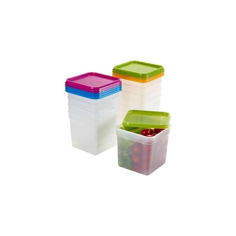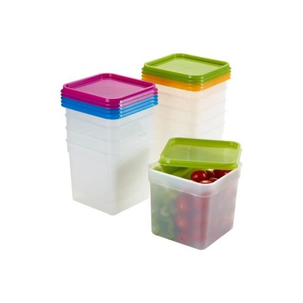• Pack of 10 sturdy containers with 10 coloured lids. 12cm sq. x 12cm H. 1.2 litre.