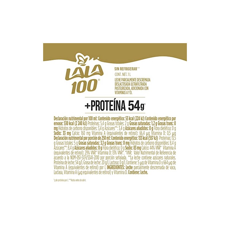 Lala 100 Leche ms Protena Sin Lactosa Parcialmente Descremada Ultrapasteurizada Reducida en Grasa con Protena sin Refrigerar, Contenido 1 Paquete con