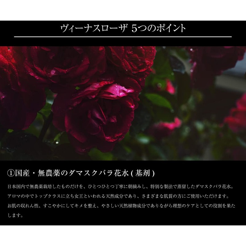 - Venus Rosa 5 Highlights: 1. Domestically produced and pesticide-free damask rose flower water (base agent), 2. 8 organic certified ingredients, 3. Sea salt and salt water derived from deep marine water (skin shaping component), 4. Vegetable Ceramide *Blend; 5. Collagen and hyaluronic acid
