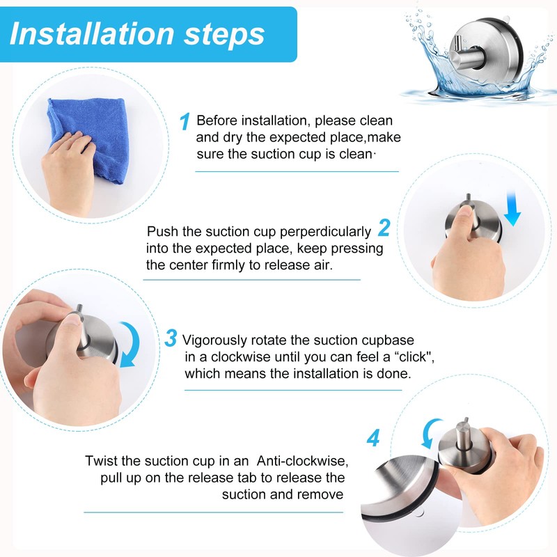 • Reusable and waterproof: the adhesive hooks are made of high-quality 304 stainless steel, durable and easy to clean. All are super waterproof, oil-proof, rust-proof, moisture-proof and heat-resistant. When removing, wash the suction cup base with warm water, you can reuse it after drying.