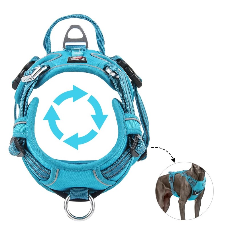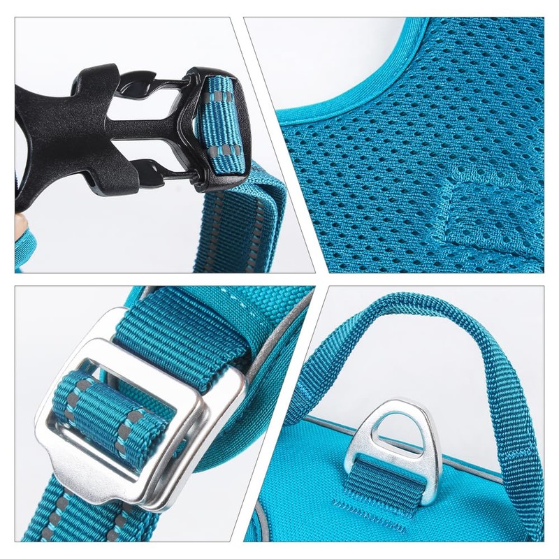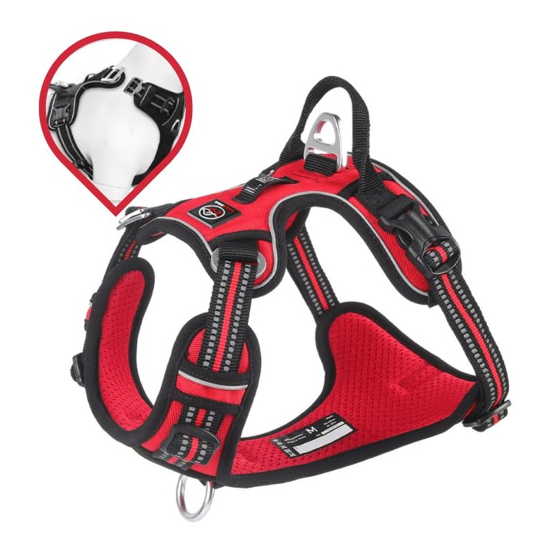 For maximum safety, 3M reflective strips ensure better visibility in the dark as well as Duraflex buckles and strong metal rings for a secure leash attachment. A padded back handle allows quick control or assistance on stairs, in the car or in special situations.