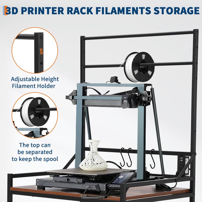 • Adjustable Spools Holder: With a height adjustable spools holder, this 3D printer desk accommodates up to ten spools of various sizes, including 200g, 500g, and 1kg. Effortlessly switch projects and keep filament within reach for a faster, smoother workflow