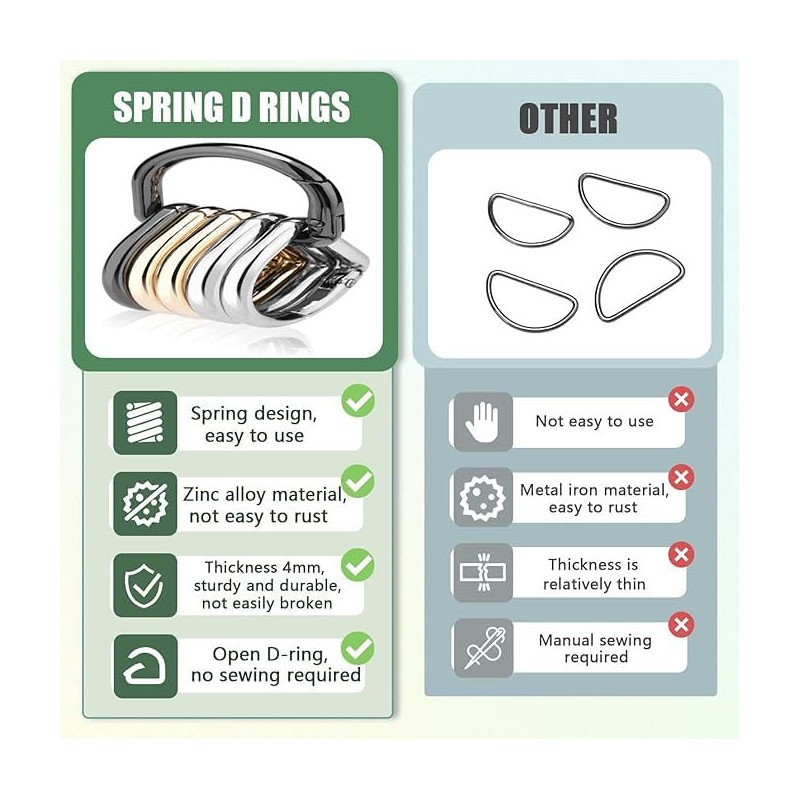 - 【Excellent Material】: The spring D-shaped hook buckle is made of zinc alloy, with high hardness, rust resistance, wear resistance, and corrosion resistance. Adopting oil seal and polishing treatment, the surface is smooth, scratch free, dustproof and waterproof.