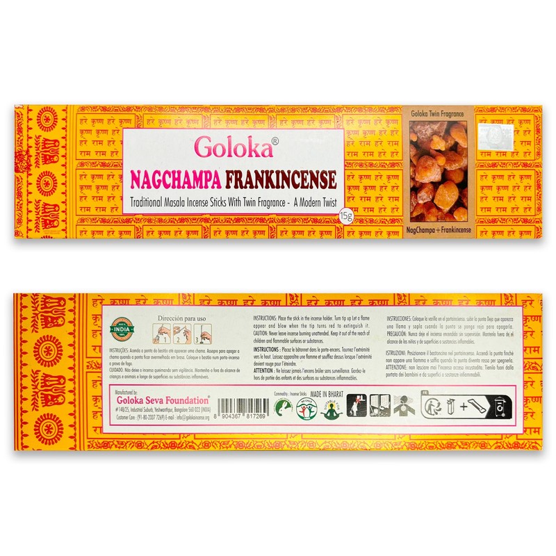- Combining unique fragrances: enjoy the classic scent of Goloka Nag Champa combined with a selection of complementary aromas for an unparalleled olfactory experience.