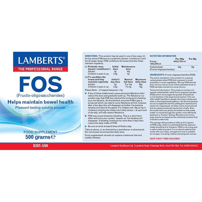 Lamberts FOS is a dietary supplement of prebiotics with oligosaccharides.