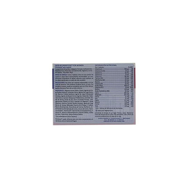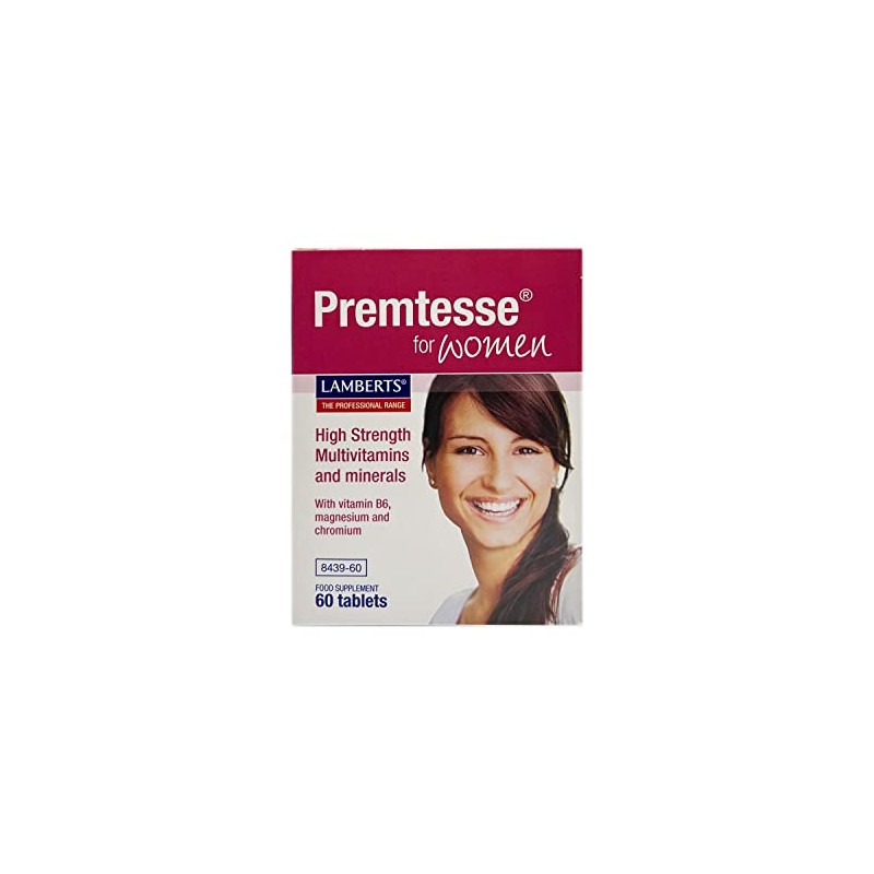 Product DescriptionLamberts Premtesse 60 TabsIngredientsTwo tablets deliver: Vitamin A 700g Vitamin E 10mg Thiamin 10mg Niacin 16mg Folic Acid and Calcium-L-Methylfolate 400g Pantothenic Acid 10mg Iron 15mg Zinc 15mg Copper 500g Selenium 110g Vitamin D3 10g Vitamin C 80mg Riboflavin 10mg Vitamin B12 100g Calcium 164mg Magnesium 250mg Iodine 150g Chromium 200g Vitamin K 75ug Vitamin B6 10mg Biotin 150ug
