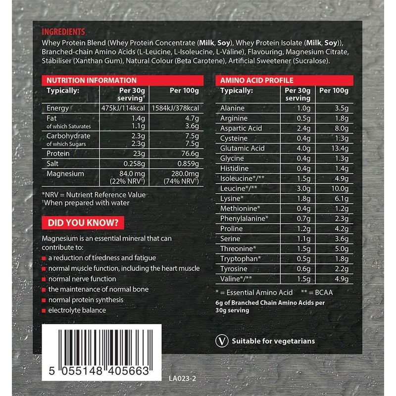 Whey Protein Blend (Whey Protein Concentrate (Milk, Soy), Whey Protein Isolate (Milk, Soy)), Branched-chain Amino Acids (L-Leucine, L-Isoleucine, L-Valine), Flavouring, Magnesium Citrate, Stabiliser (Xanthan Gum), Natural Colour (Beta Carotene), Artificial Sweetener (Sucralose).