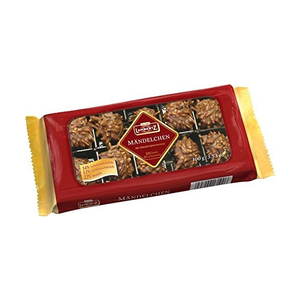 Lambertz coat almond gingerbread and a cover of milk chocolate and dark chocolate. Almond gingerbread from Lambertz must be placed on every Christmas plate. The gingerbread with the pleasantly spicy taste and the crisp almond pencils should not be missing at any Christmas party. 34% milk chocolate, 12% dark chocolate and 22% almonds.