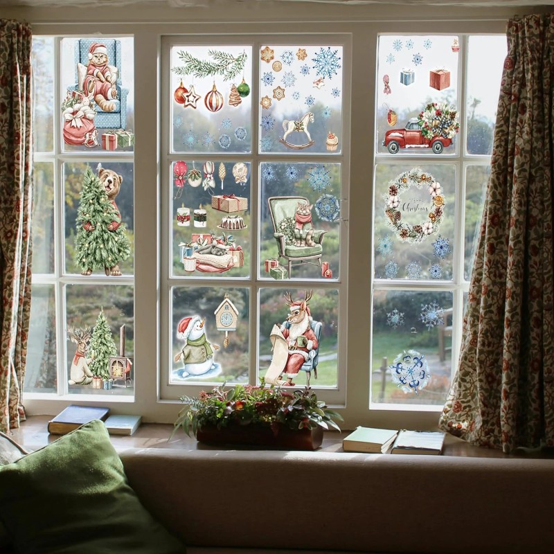 • 🎅【Easy to Install】🎄 No glue is required. Before applying the Xmas window stickers, clean the surface and spray a little water. Then, place the stickers in your desired position. (Tip: For best results, apply on flat, smooth surfaces like doors, windows, mirrors, refrigerator doors, or microwave ovens.)