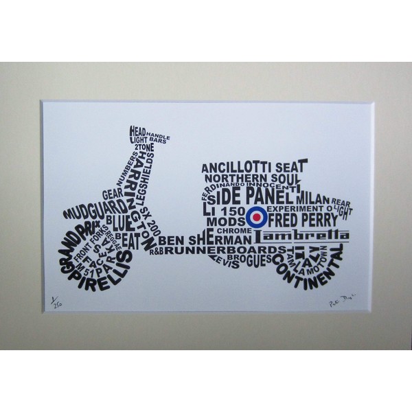 "Lambretta" is a signed limited edition print created using 40 words associated with Lambretta scooters and the Mod scene. The print shows the side view of the Lambretta Scooter. "Lambretta" has been printed on 230 gram archival art paper and has been mounted using a cream mount, and backed ready framing. Fits directly into a standard A4 frame. Close up details of the print can be seen in the secondary images. Comes with a signed and numbered Certificate of Authenticity, which includes all the words used to create the design, see image 5. Northern Soul Art - only for The In Crowd! Keep The Faith!!