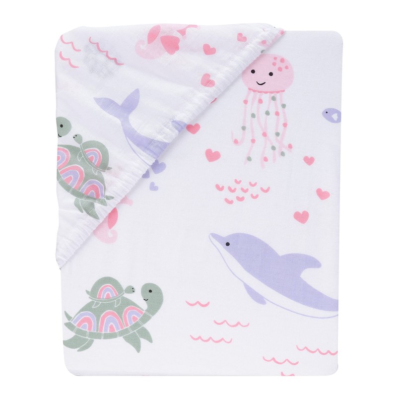 - Features dolphins, sea turtles, jellyfish, sea horses, small fishes, and coral on a soft white ground