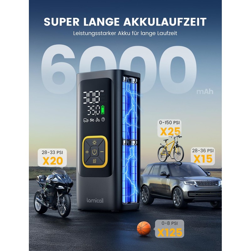 - 【6000mAh Lange Akkulaufzeit & Schnelles Aufblasen】Lamicall 2025 tragbare elektrische Luftpumpe für Auto ist mit einem 6000mAh Akku ausgestattet, der eine längere Akkulaufzeit bietet. Bei voller Ladung kann sie bis zu 40 Min. lang ununterbrochen betrieben werden. Mit dem hochpräzisen Zylinder aus Alu-Legierung kann sie einen maximalen Aufpumpdruck von 150 PSI/10,3 bar erreichen und einen Autoreifen in nur einer Min. von 28 PSI auf 36 PSI aufpumpen. Effizientes und schnelles Aufpumpen spart Zeit & Mühe.