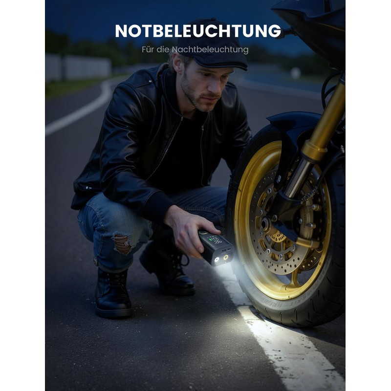 - 【Multifunktionales Notfallgerät – Mehr als Aufblasen】Der USB-A-Ausgang an der Oberseite der Akku Kompressor kann als Notenergie für Handy verwendet werden. Die obere LED-Leuchte bietet 3 Modi: Dauerlicht, Blink & SOS, sodass Sie sich bei nächtlichen Notfällen sicher fühlen können. Mit Hilfe der 3 Düsenarten, kann die Pumpe Autos, Motorrad, Fahrrad, Bälle und andere aufblasbare Geräte aufpumpen. Die Metall-Luftdüse ist mit Silikon überzogen, um Verbrennungen durch hohe Temperaturen zu vermeiden.