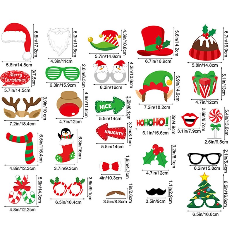 - đ ăChristmas Theme Designă This Christmas Photo Booth Props Kit with 32 Pcs different Xmas photo props,including beards, glasses, Christmas stockings, trees, bows, lollipops, gift boxes, hats, headwear, red lips and more. Can create many combinations and are sure to be a hit with friends and family as funny Christmas party decorations.