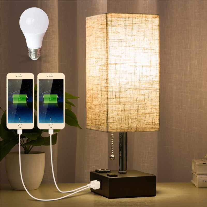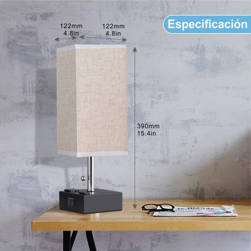 Lámpara de sobremesa, lámpara de cabecera con bombilla LED blanca cálida, lámpara de escritorio única con dos puertos de carga y toma de corriente