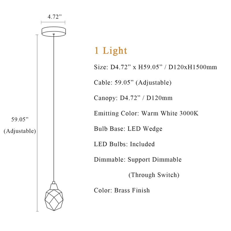 - 【Specification】 Size: D4.72” x H59.05” / D120xH1500mm. The Length of Hanging Wire: 59.05” / 1500mm (Adjustable). Canopy Size: D4.72” / D120mm. Canopy: Round and Brass Canopy. Color: Brass Finish. Emitting Color: Warm White 3000K. Lamp Socket: LED Wedge. Heads: 1Light. Wattage: 3W. Bulb Included: Yes. Dimmable: Support Dimmable (Through Switch).