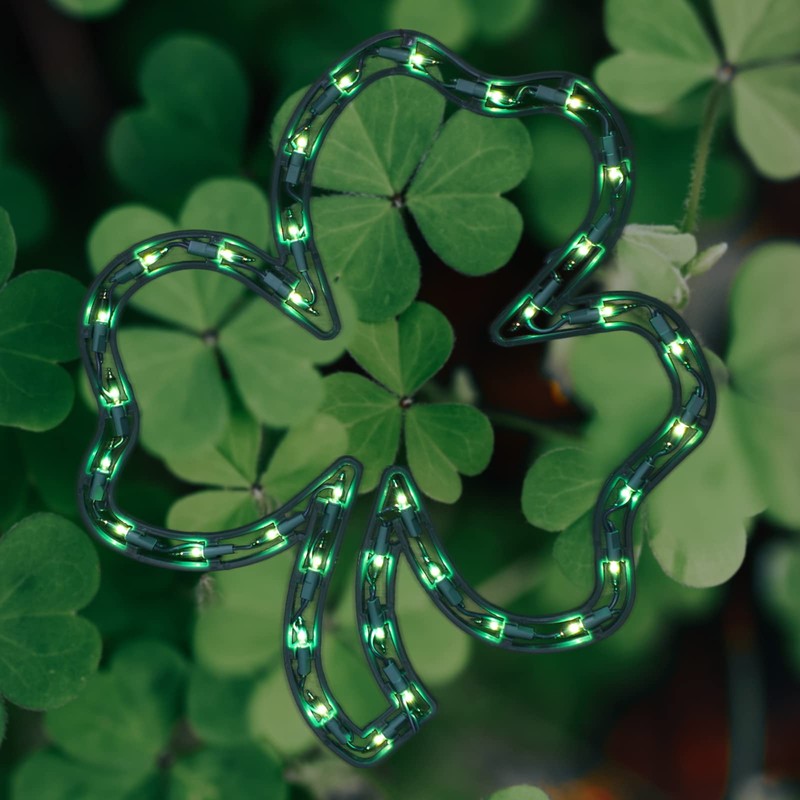 - PACKAGE AND SIZE:35 mini lights on green wire, St Patrick's Day Shamrock Window Silhouette Decoration measures 16.5x 14.2 Inch making this lighted St. Patrick's Day decoration big enough to be hung in a window or outside and will dress up your indoor or outdoor decor;2 pcs replacement bulbs,1 flasher bulb, 2pcs spare fuses,2 pcs cable ties and 1 pc suction cup included.