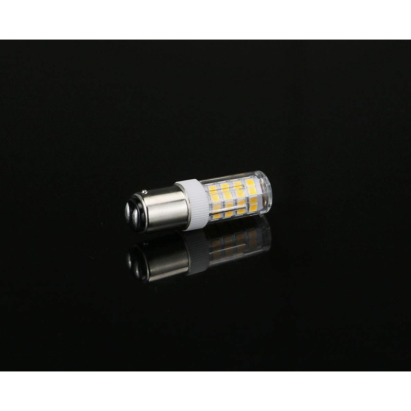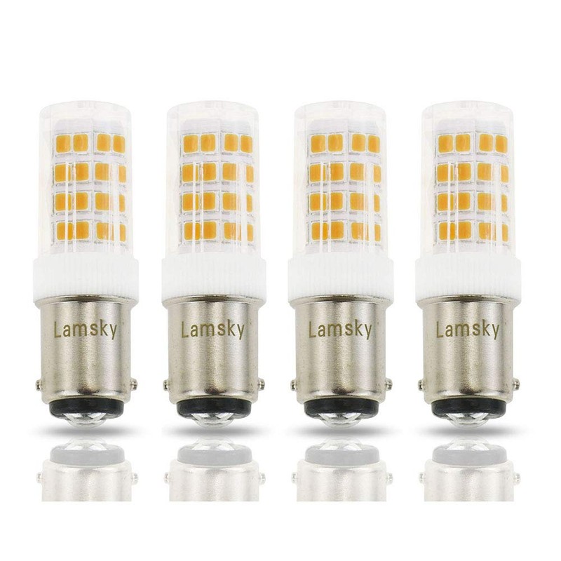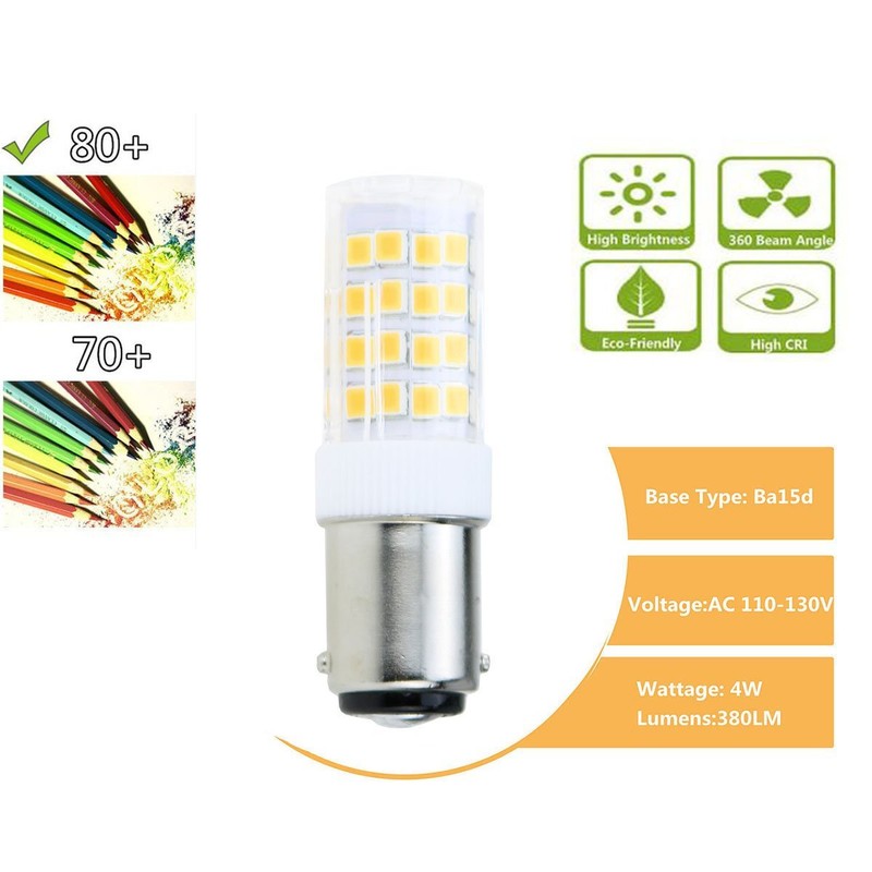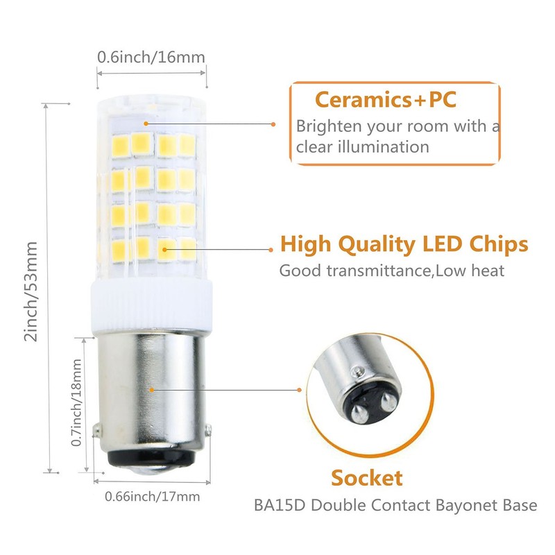 Lamsky BA15D LED Light Bulb T3/T4/C7/S6 LED Halogen Replacement Bulb Lamp Base: Ba15d(DC Bayonet Base) Dimension: Φ16*47MM(D0.6xL1.9 inches) Power:4 Watts LEDs: 51pcs High Brightness 2835Smd LEDs CRI: >80 **Input Voltage: AC 110-130V** **Luminous Flux: 380lm** Light Color: Warm White 2700k Light Beam angle: 360 degree Dimmable: No Material: Ceramics+PC Warranty: 2 years **High Efficiency Lighting** This BA15D bulb uses **51 pcs High Brightness 2835Smd LEDs** and transparent plastic cover.Each BA15D LED bulb provides approximately 380 lumen of light.Compared with halogens and CFLs,It gives off much less heat and emits much more light. **Energy Saving** Lamsky BA15D light bulb only use 4W energy, which can perfectly replace 35-40W halogen bulbs.Not only save 90% cost of your electricity bill,but also save cost on light bulb purchasing and reduce the frequency of re-lamping because of the ultra-long lasting performance with 30,000 hours lifespan. **Widely Application** Standard BA15D Base LED Bulbs,easy to install.Use for sewing machine light,pendant light,vacuum cleaner light,reading lamp and desk lamp, etc. **Confidence Guarantee** Free 2-year unlimited warranty is offered to our customers.If for any reason you are not happy with any product by us,please do not hesitate to contact us and will do our best to solve your problem asap! **Attention:** 1Before installing, please note this BA15D LED Bulb is powered by AC 110-130V circuit. 2.Please note this bulb is not dimmable. 3.BA15D means the double bayonet socket on the top and the diameter of the socket is 15mm. >4.If the bulb does not work.It may be due to the ageing of the machine,resulting in poor contact between the lamp holder and the bulb,please try to rotate the light bulb 180 degrees to install it.