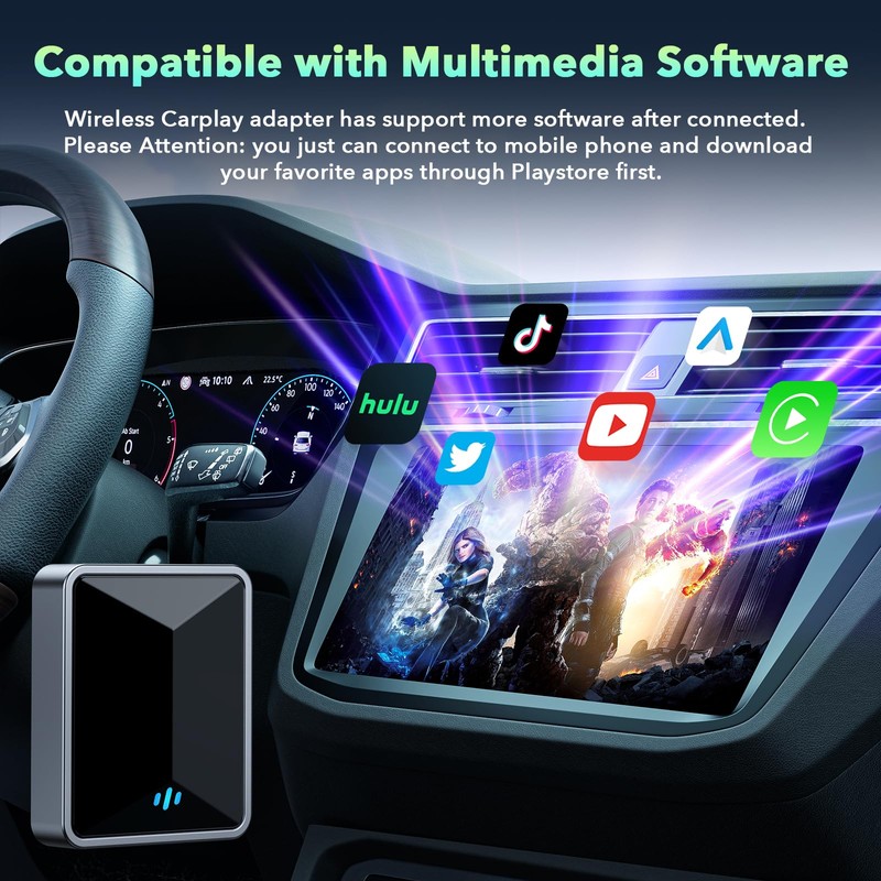 - đ ă5.8Ghz WiFi & Fast Transmissionă a-pple car play wireless adapter with wireless connectivity and 5.8Ghz WiFi, access your phone apps on your vehicle screen hassle-free. Enjoy GPS online mapping, music playback, messaging, and calls wirelessly while preserving your car's original operations, and the establishment of secure and reliable driving environment.(Requires Android 11.0 + & iOS 10 + or above.)