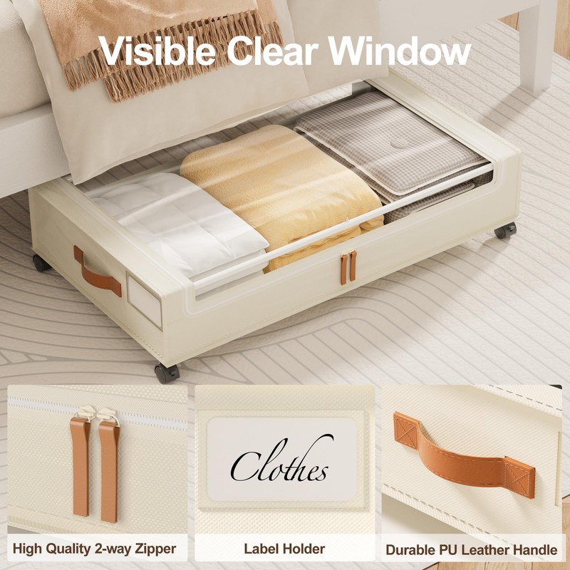 LAMU 2 Pack Under Bed Storage with Wheels, 50L Large Lapacity UnderBed Storage Containers with Clear Lid and Handles, Under the Bed Storage Bins Drawers for Clothes, Blankets, Shoes, Books, Beige