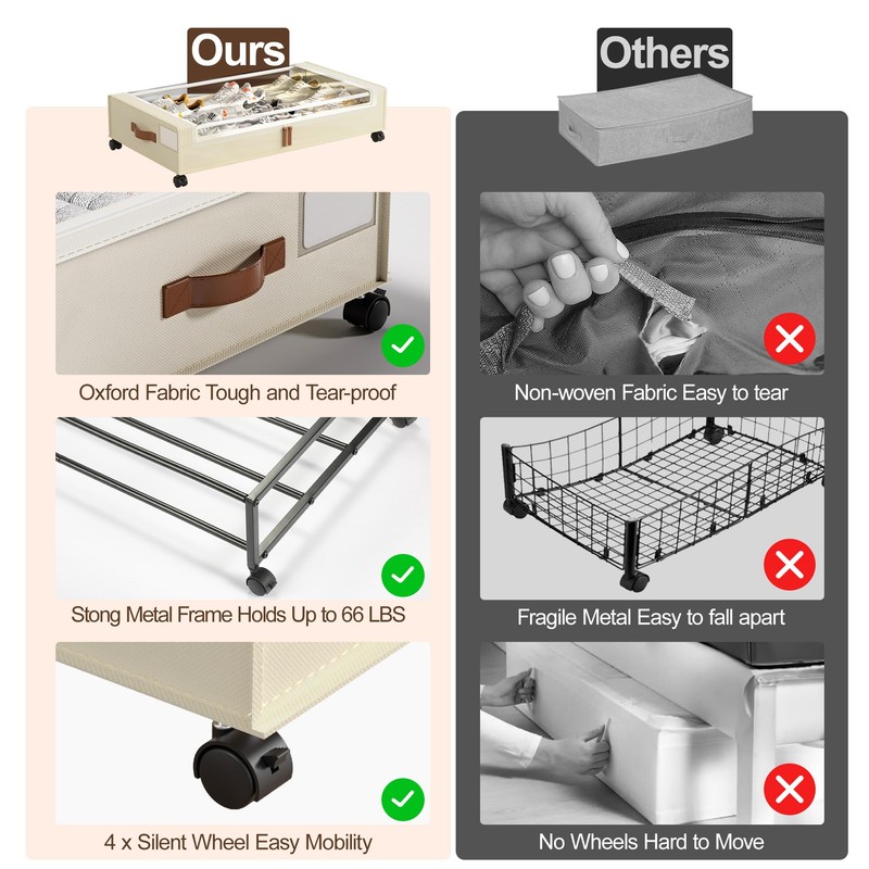 - Durable & Heavy-Duty Build: Made of 600D Oxford fabric with PU leather handles, LAMU underbed storage is tear-resistant and built to last. The sturdy all-metal frame supports up to 66 lbs, making it perfect for books, shoes, and more. Unlike flimsy metal mesh under bed storage containers, this design ensures durability and strength for long-term use