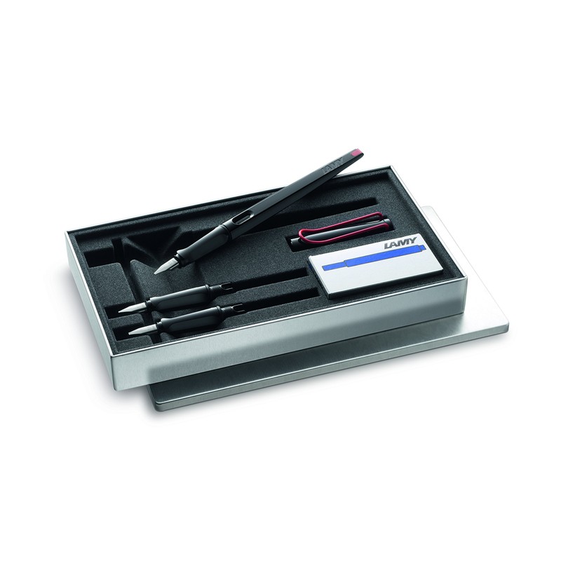 - CONTENTS - 1 LAMY Joy calligraphy fountain pen with shiny black body and a red clip, a choice of 3 different chisel nib sizes (1.1 mm, 1.5 mm, 1.9 mm), and 1 packet of LAMY T10 black ink cartridges, plus a single blue cartridge, all contained in a sleek and shiny metal tin case.