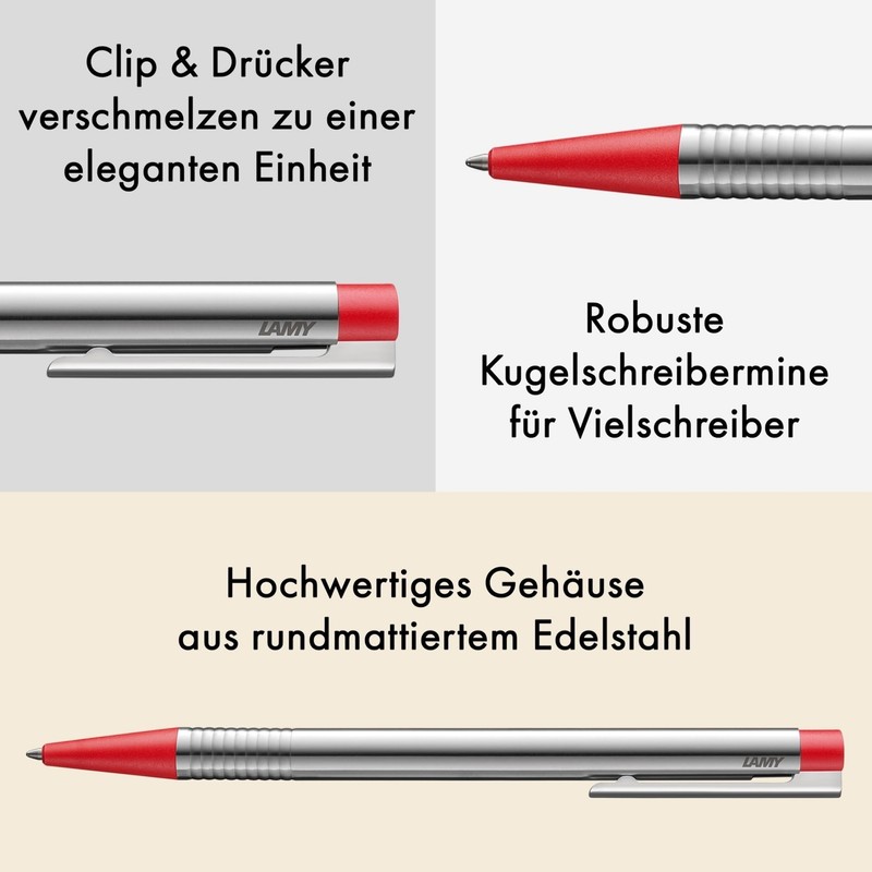 - Aesthetic and robust: the Lamy logo pen impresses with its round matte housing made of robust stainless steel. As usual, the Lamy logo ballpoint pen is of course manufactured to a high quality.
