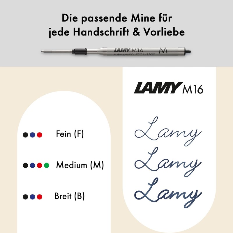 - Accessories included: Enjoy the pleasant writing experience with the included red large capacity refill LAMY M 16 in line width M. Tip for supplement: A matching fountain pen, multi-system pen and mechanical pencil expand creativity and applications.
