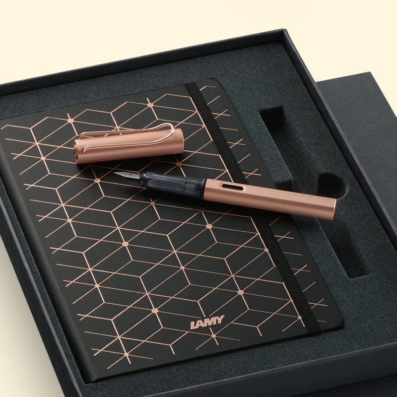 - Box contents: 1x Lamy Lx Special Edition set 076 in rose gold: fountain pen nib size M, including 1x large capacity Lamy T10 ink cartridge in blue and 1x Lamy paper notebook soft cover A5 - incl. gift box