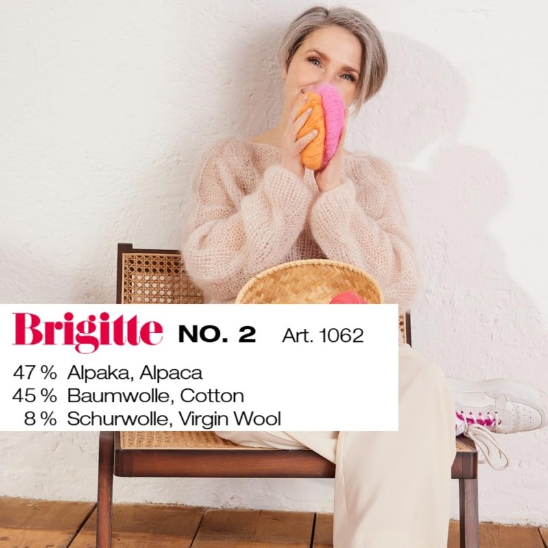 - Noble material combination for year-round comfort: Brigitte No.2 combines the softness of alpaca, the coolness of cotton and the warmth of virgin wool to create a yarn valued for its exceptional comfort and versatility. Ideal for projects that bring joy all year round.