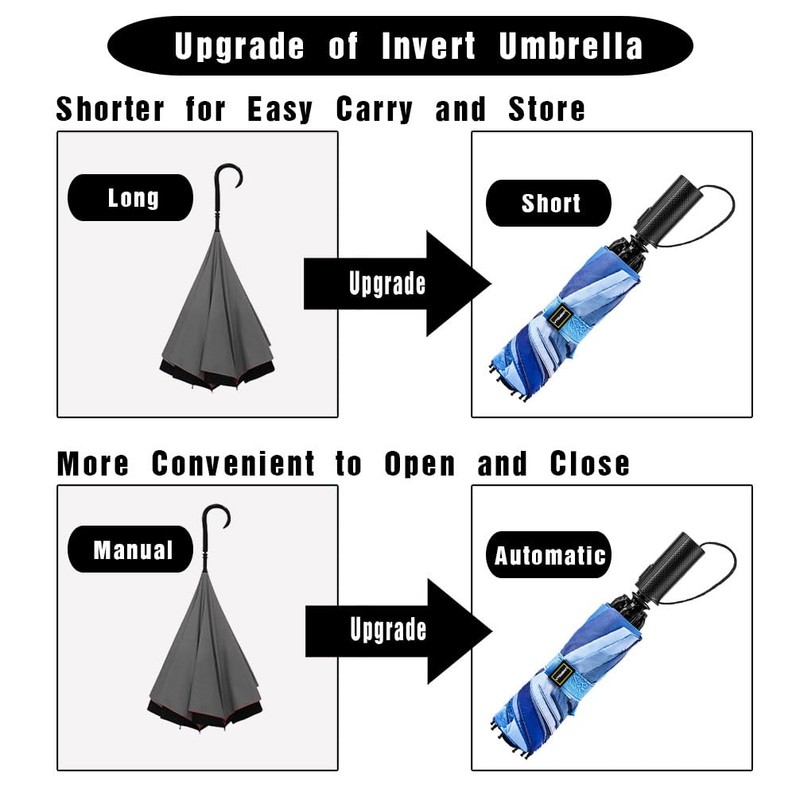 - COMPACT, PORTABLE AND EASY CARRYING: This is an upgrade design of the longer reverse folding umbrella, more light weight and more compact easy carry. This reverse umbrella is more easy to store in your car, your briefcases, backpacks, tavel bags etc.