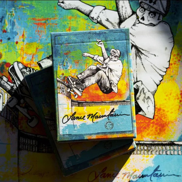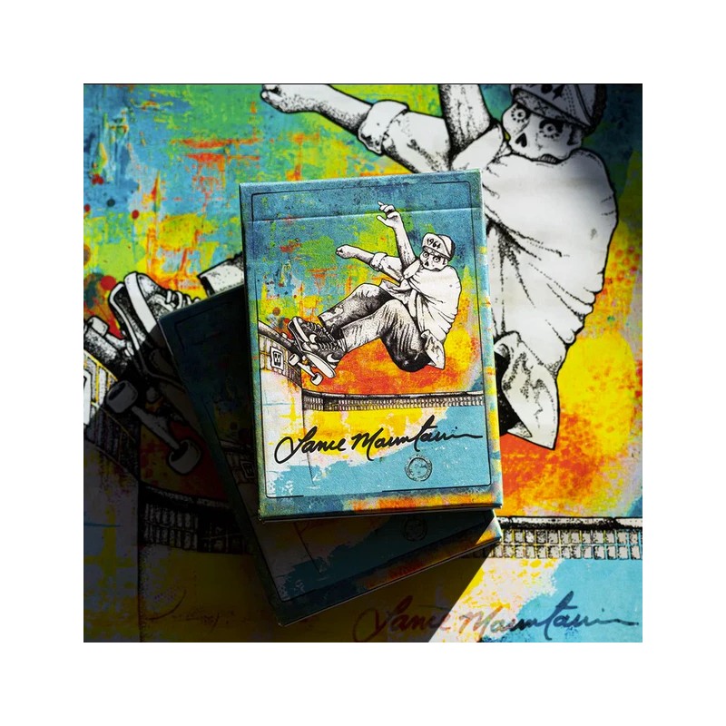 52 of these were HAND SIGNED by Lance. Own a piece of skateboarding history today and cherish a signed deck by Lance. On June 13th Lance Mountain will celebrate a true milestone--his birthday. For this occasion only 250 of these standard editions were created featuring a LM Style Painted Background and Exquisite Tuck Box that was painted by Lance. Very limited and completely unique. Each illustration featured in this deck was hand drawn by skateboarding legend and artist, Lance Mountain. Lance drew these skeletal renditions of iconic skateboard photos of himself with rapidograph pens. This is a work of art. The tuck box was hand painted by Lance in a wild concoction of complimentary colors. Each court card features a totally unique illustration. All the suits are hand created and aged accordingly. Designed by Lance Mountain. Produced by Fulton's Playing Cards. Printed on premium cardistry playing card stock in China.