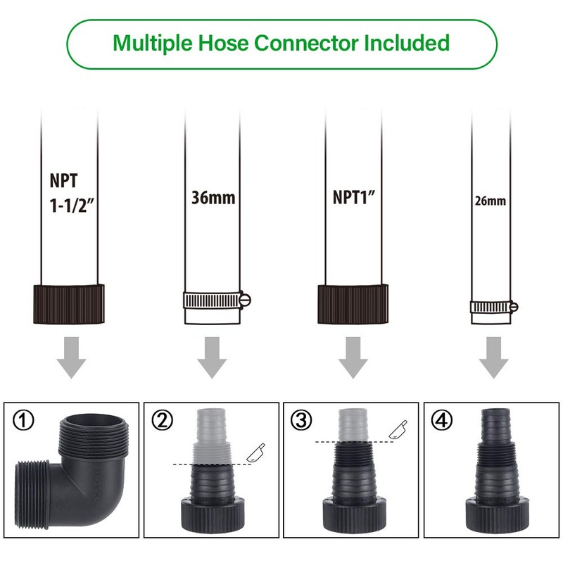 - 【Professional Accessories】The fountain pump with asscessories. Rugged and corrosion-resistant plastic construction for durability; NPT 1 inch discharge; Included hose adapter fits 1-1/2, 1-1/4 or 1 inch hose